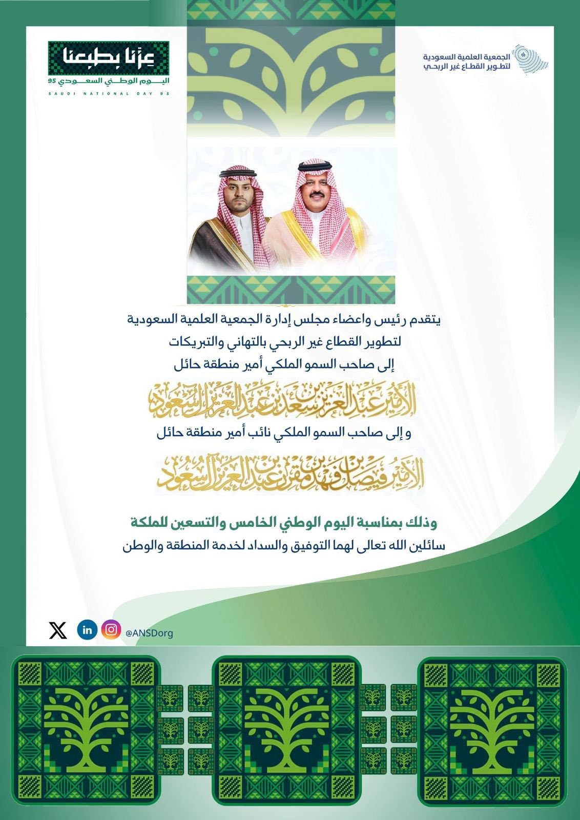 رئيس وأعضاء #الجمعية_العلمية_السعودية_لتطوير_القطاع_غير_الربحي يهنئون سمو أمير منطقة حائل الأمير عبدالعزيز بن سعد، وسمو نائبه الأمير فيصل بن فهد – حفظهما الله – بمناسبة #اليوم_الوطني_السعودي_٩٥، داعين الله دوام الأمن والازدهار للوطن. #عزنا_بطبعنا